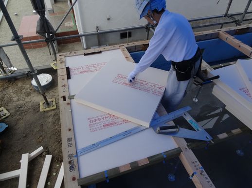 外部では、外壁塗りの中塗り工事が行われています。約2週間ほど乾燥させてから仕上げの漆喰塗りを行います。内部の珪藻土塗り工事も順調です。