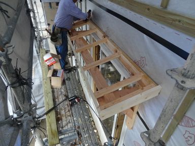 本日、住宅担保責任保険の検査が行われました。無事に合格。外部では大工さんが造作庇を作っています。