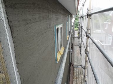 造作工事も終了し、内部の珪藻土塗りの準備の入ります。外部では、外壁塗りの下地工事が進められています。